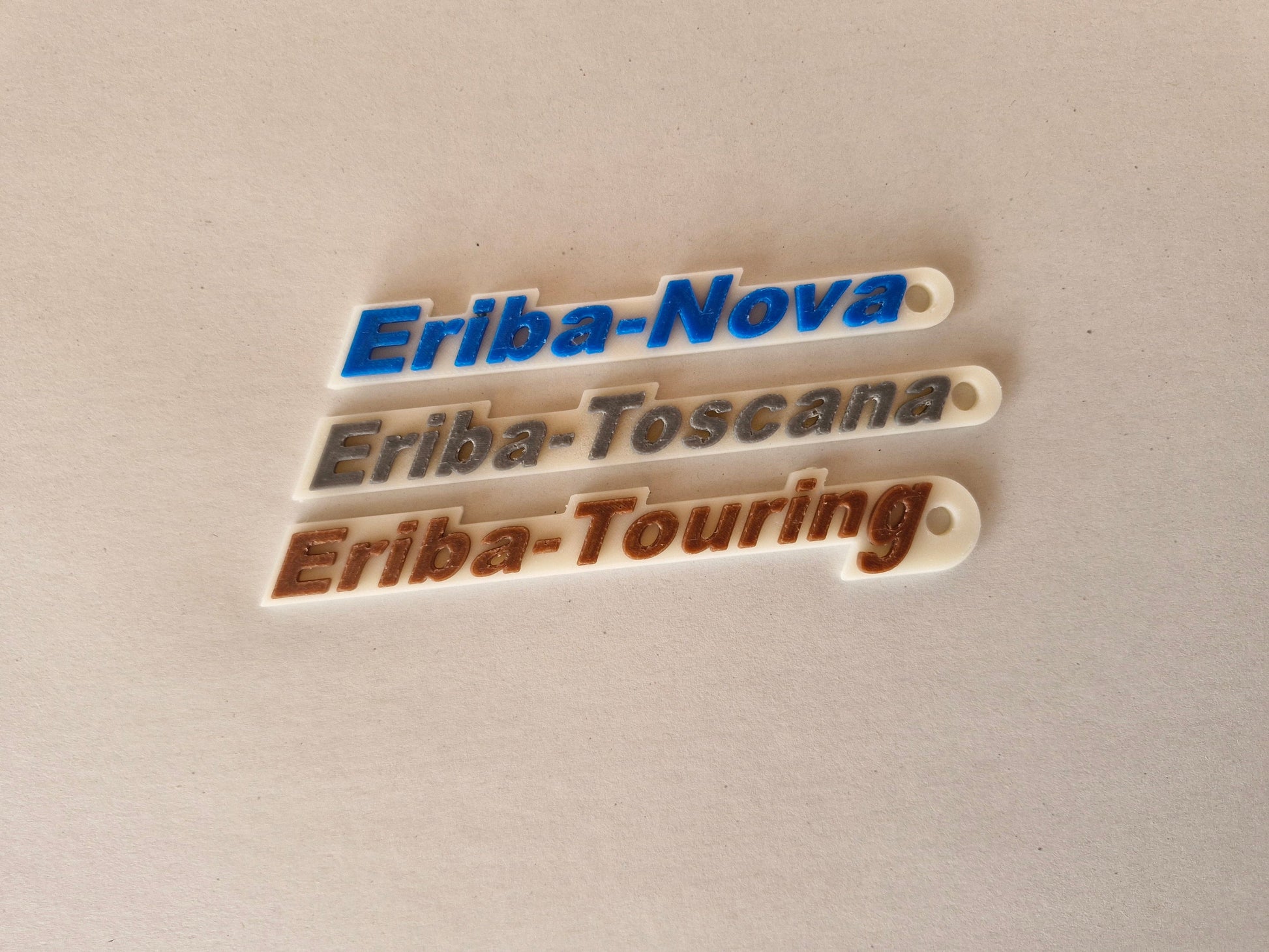 Ein stilvoller Schlüsselanhänger für Wohnwagenfans! Robustes Material, elegantes Design und erhabene Schriftzüge für „Eriba Nova“, „Eriba Touring“ und „Eriba Toscana“. Perfekt für jeden Schlüsselbund! Die Farben für den Schlüsselanhänger können Sie sich aussuchen. Verfügbar sind: Blau, Grau und Braun